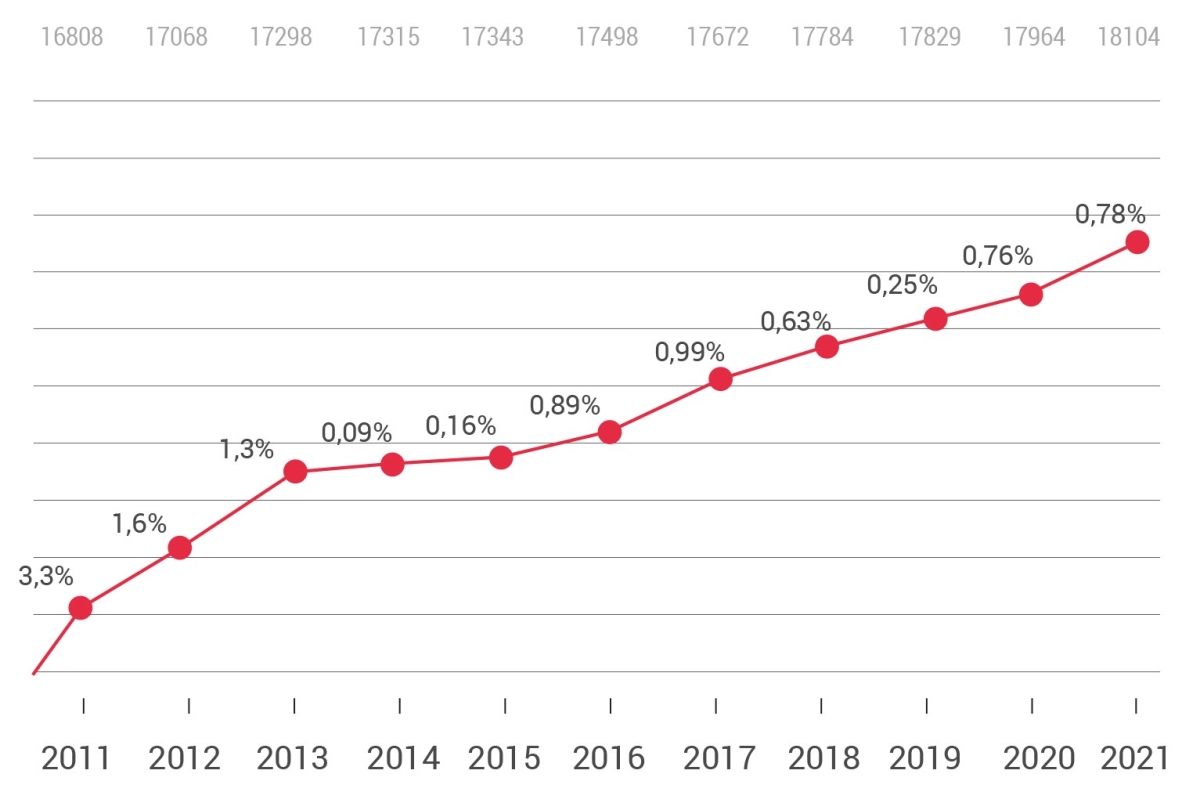 Op 1 januari 2022 staan 18.104 advocaten op het tableau ingeschreven, een beperkte toename van 0,8% ten opzichte van vorig jaar (17.964). De licht stijgende lijn van de afgelopen jaren zet hiermee door.